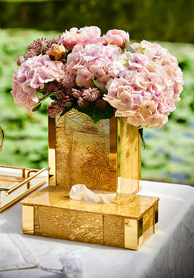 C/310 G : Gold leaf plexi Tissue box/Kleenex box, gold plated details – h. 70 mm – 275×140 mmDETAILSC/312 G : Gold leaf plexi tissue basket, gold plated details – h. 250 – Ø 190
