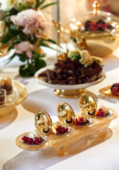 DETAILSSnack and sauce holder, gold leaf plexi base, n. 4 glass bowls, gold plated lids – 450×135 mm