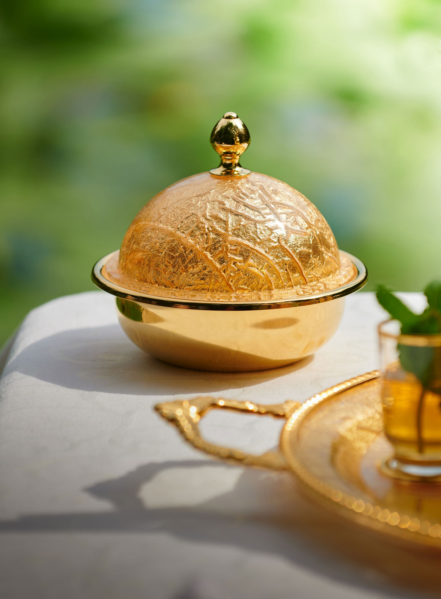 DETAILSPorta vivande in gold plated, coperchio in plexi foglia oro, ceramica interna – Ø 190 mm