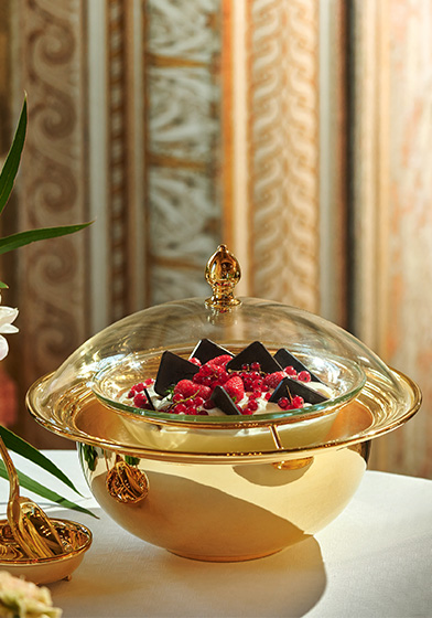 C/340 CMaggiori informazioniBowl porta gelato in gold plated con supporto per coppa interna in vetro, coperchio in plexiglass trasparente – Ø 380 mm