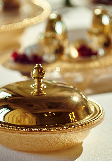 C/101Maggiori informazioniPorta vivande in gold plated, coperchio in plexi foglia oro, ceramica interna – Ø 190 mm